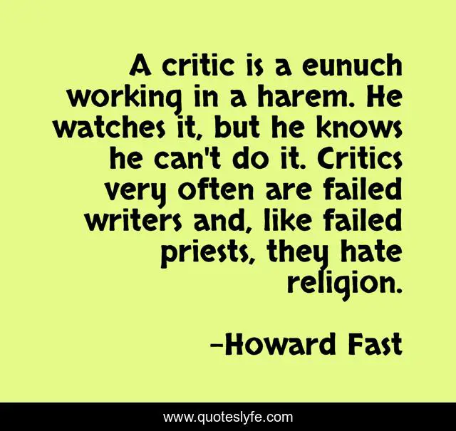 This page presents the quote "A critic is a eunuch working in a harem. He watches it, but he knows he can't do it. Critics very often are failed writers and, like failed priests, they hate religion.". Author of this quote is Howard Fast. This quote is about hate, watches, working,.