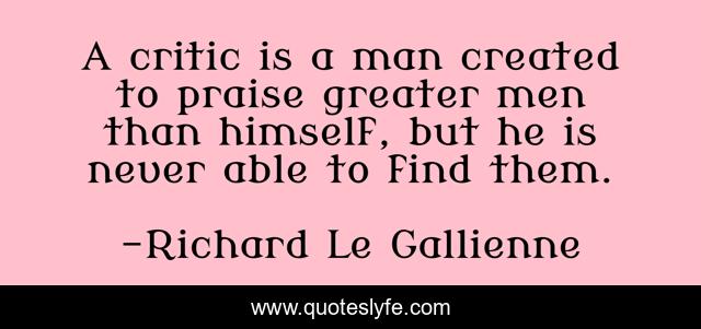 This page presents the quote "A critic is a man created to praise greater men than himself, but he is never able to find them.". Author of this quote is Richard Le Gallienne. This quote is about critics, ego, writing,.