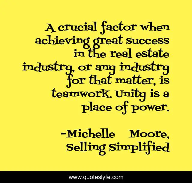 This page presents the quote "A crucial factor when achieving great success in the real estate industry, or any industry for that matter, is teamwork. Unity is a place of power.". Author of this quote is Michelle Moore, Selling Simplified. This quote is about team-work, selling, sales-training, success, unity,.