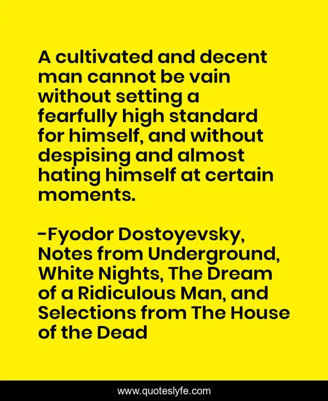 This page presents the quote "A cultivated and decent man cannot be vain without setting a fearfully high standard for himself, and without despising and almost hating himself at certain moments.". Author of this quote is Fyodor Dostoyevsky, Notes from Underground, White Nights, The Dream of a Ridiculous Man, and Selections from The House of the Dead. This quote is about notes-from-the-underground, fyodor-dostoyevsky, vanity,.