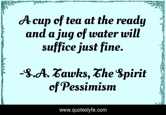 This page presents the quote "A cup of tea at the ready and a jug of water will suffice just fine.". Author of this quote is S.A. Tawks, The Spirit of Pessimism. This quote is about spirituality, author, writing, imagination, reader, reading,.