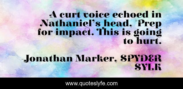 This page presents the quote "A curt voice echoed in Nathaniel’s head, "Prep for impact. This is going to hurt.". Author of this quote is Jonathan Marker, SPYDER SYLK. This quote is about drop, fall,.