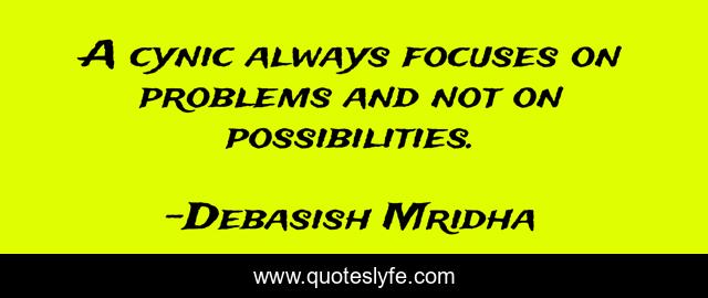 This page presents the quote "A cynic always focuses on problems and not on possibilities.". Author of this quote is Debasish Mridha. This quote is about cynical, philosophy, debasish-mridha, quotes, debasish-mridha-md, inspirational, enthusiasm, don-t-focus-on-problems, what-is-a-cynic,.