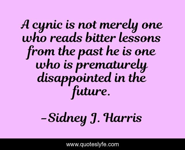 This page presents the quote "A cynic is not merely one who reads bitter lessons from the past he is one who is prematurely disappointed in the future.". Author of this quote is Sidney J. Harris. .