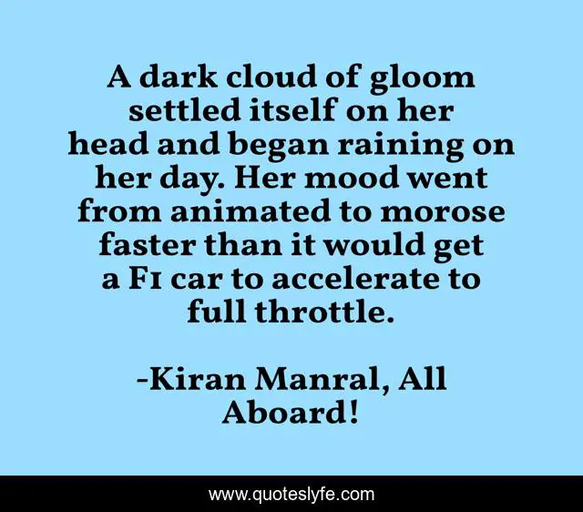 This page presents the quote "A dark cloud of gloom settled itself on her head and began raining on her day. Her mood went from animated to morose faster than it would get a F1 car to accelerate to full throttle.". Author of this quote is Kiran Manral, All Aboard!. This quote is about sadness, mood, humour,.