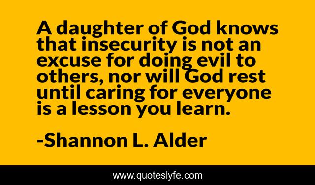 This page presents the quote "A daughter of God knows that insecurity is not an excuse for doing evil to others, nor will God rest until caring for everyone is a lesson you learn.". Author of this quote is Shannon L. Alder. This quote is about liar, controlling-spouses, unjustified, growth, manipulatora, mentally-biased, self-righteous, illegal, twisted,.