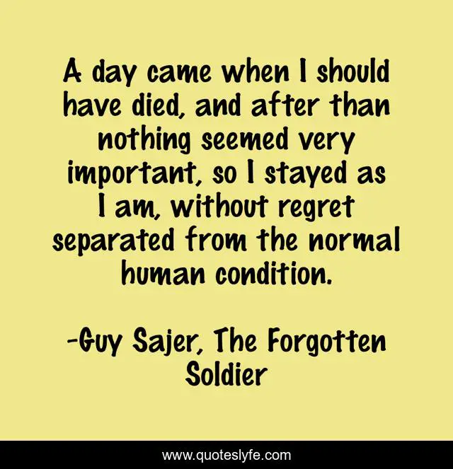 This page presents the quote "A day came when I should have died, and after than nothing seemed very important, so I stayed as I am, without regret separated from the normal human condition.". Author of this quote is Guy Sajer, The Forgotten Soldier. This quote is about wwii, politics, violence, history, soldiers,.