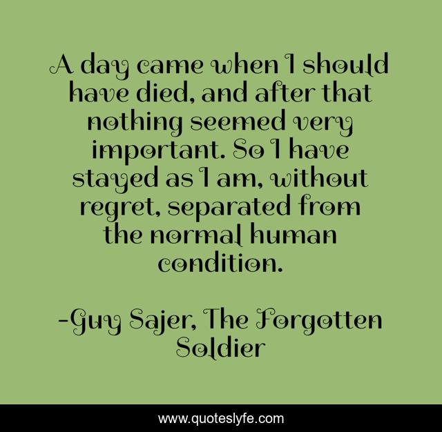This page presents the quote "A day came when I should have died, and after that nothing seemed very important. So I have stayed as I am, without regret, separated from the normal human condition.". Author of this quote is Guy Sajer, The Forgotten Soldier. This quote is about world-war-ii, memoir, third-reich,.