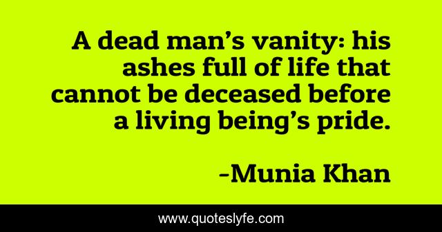 This page presents the quote "A dead man’s vanity: his ashes full of life that cannot be deceased before a living being’s pride.". Author of this quote is Munia Khan. This quote is about pride, livingbeing, dead, vanity,.