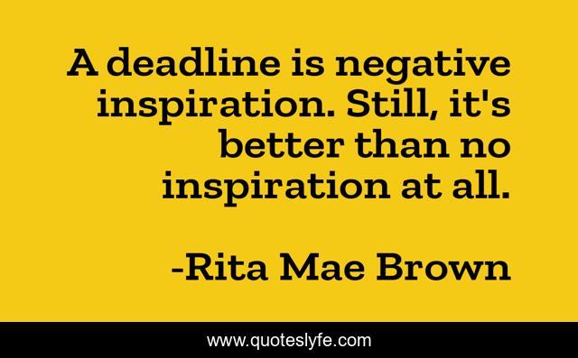 This page presents the quote "A deadline is negative inspiration. Still, it's better than no inspiration at all.". Author of this quote is Rita Mae Brown. This quote is about art, deadlines, inspiration,.