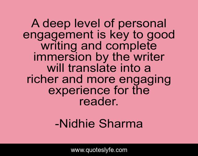 This page presents the quote "A deep level of personal engagement is key to good writing and complete immersion by the writer will translate into a richer and more engaging experience for the reader.". Author of this quote is Nidhie Sharma. This quote is about storyteller-secret, author,.