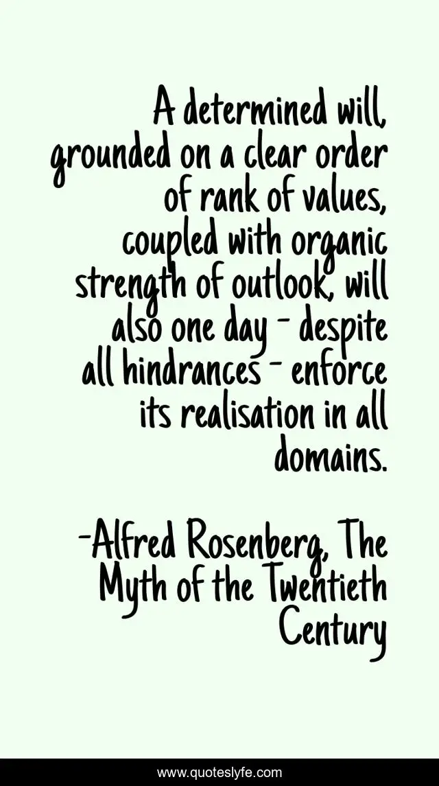 This page presents the quote "A determined will, grounded on a clear order of rank of values, coupled with organic strength of outlook, will also one day - despite all hindrances - enforce its realisation in all domains.". Author of this quote is Alfred Rosenberg, The Myth of the Twentieth Century. This quote is about power-of-will, determination, power,.