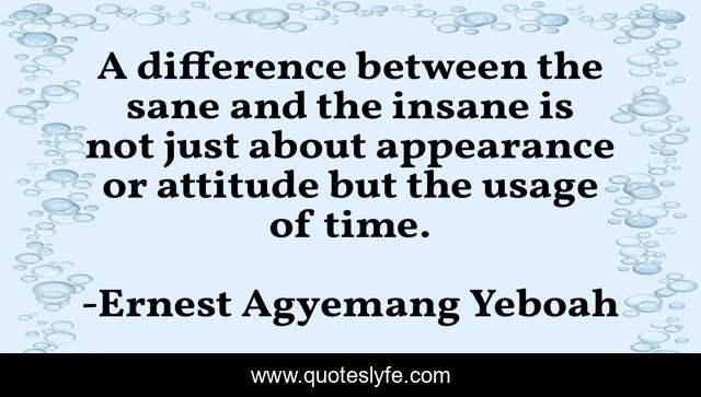 This page presents the quote "A difference between the sane and the insane is not just about appearance or attitude but the usage of time.". Author of this quote is Ernest Agyemang Yeboah. This quote is about sanity, life, appearance, respect-for-time, insanity, behaviour, attitude, the-essence-of-life, the-essence-of-time,.