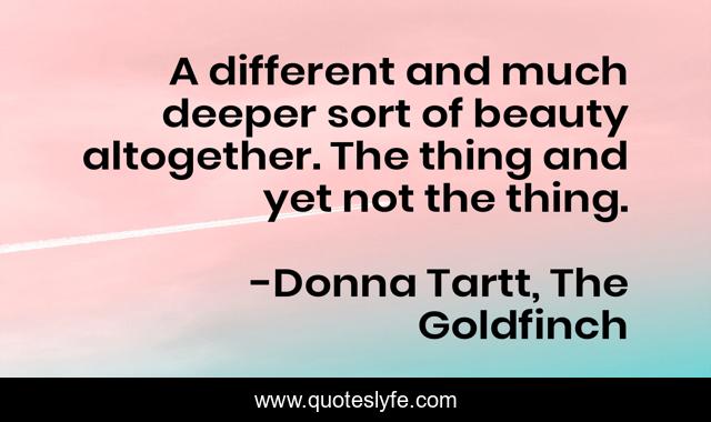 This page presents the quote "A different and much deeper sort of beauty altogether. The thing and yet not the thing.". Author of this quote is Donna Tartt, The Goldfinch. .