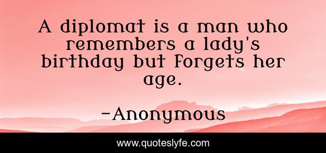 This page presents the quote "A diplomat is a man who remembers a lady's birthday but forgets her age.". Author of this quote is Anonymous. .