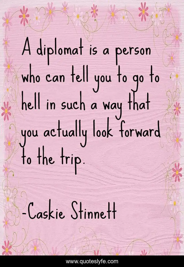 This page presents the quote "A diplomat is a person who can tell you to go to hell in such a way that you actually look forward to the trip.". Author of this quote is Caskie Stinnett. This quote is about hell, look,.