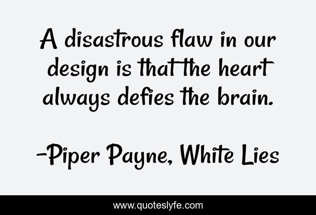 This page presents the quote "A disastrous flaw in our design is that the heart always defies the brain.". Author of this quote is Piper Payne, White Lies. This quote is about broken-heart, heartache, falling-in-love, flaws, relationships, angst, breakup, love-hurts, emotional,.