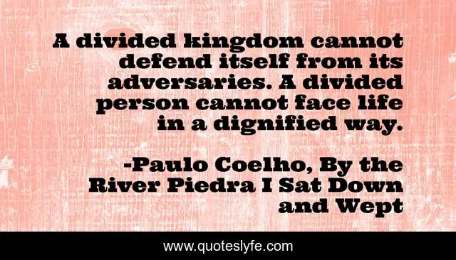 This page presents the quote "A divided kingdom cannot defend itself from its adversaries. A divided person cannot face life in a dignified way.". Author of this quote is Paulo Coelho, By the River Piedra I Sat Down and Wept. This quote is about divided, adversaries, life, truth,.