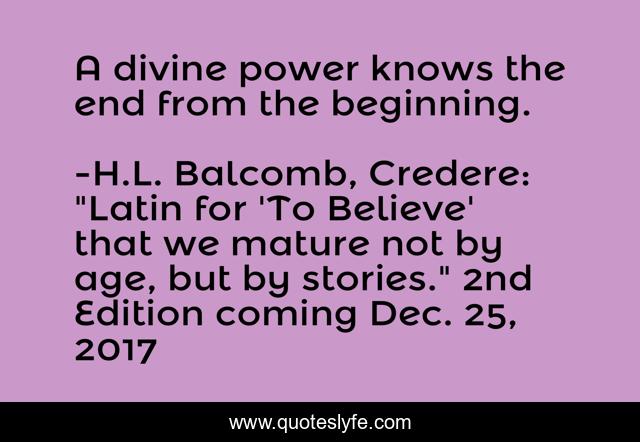 "H.L. Balcomb, Credere: "Latin for 'To Believe' that we mature not by age, but by stories." 2nd Edition coming Dec. 25, 2017 Quotes." Quoteslyfe.com, 2025. Fri. 05 Dec. 2025. <https://www.quoteslyfe.com/quote/A-divine-power-knows-the-end-from-29447>.