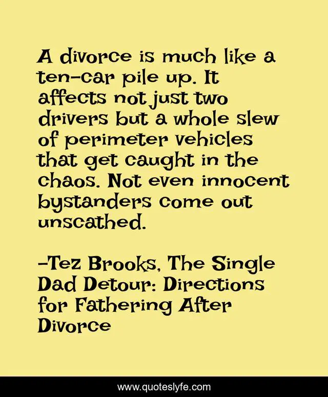 This page presents the quote "A divorce is much like a ten-car pile up. It affects not just two drivers but a whole slew of perimeter vehicles that get caught in the chaos. Not even innocent bystanders come out unscathed.". Author of this quote is Tez Brooks, The Single Dad Detour: Directions for Fathering After Divorce. This quote is about single-dads, divorce, innocent-bystanders, hurting-others,.