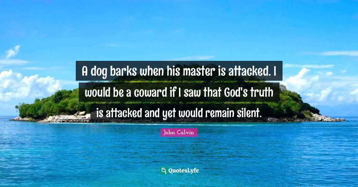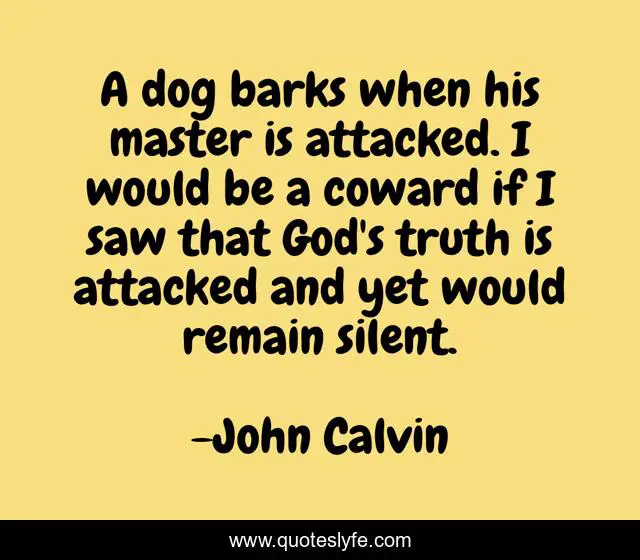 This page presents the quote "A dog barks when his master is attacked. I would be a coward if I saw that God's truth is attacked and yet would remain silent.". Author of this quote is John Calvin. This quote is about dog, truth, truth is,.
