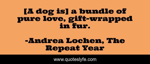 This page presents the quote "[A dog is] a bundle of pure love, gift-wrapped in fur.". Author of this quote is Andrea Lochen, The Repeat Year. This quote is about repeat, love, gift, dog, year, affection,.