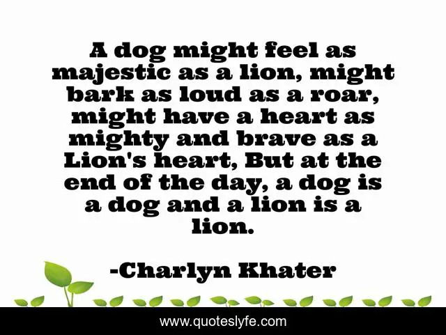 This page presents the quote "A dog might feel as majestic as a lion, might bark as loud as a roar, might have a heart as mighty and brave as a Lion's heart, But at the end of the day, a dog is a dog and a lion is a lion.". Author of this quote is Charlyn Khater. This quote is about brave, roar, pretend, dog, lion, lions, pretending, mighty, bark,.