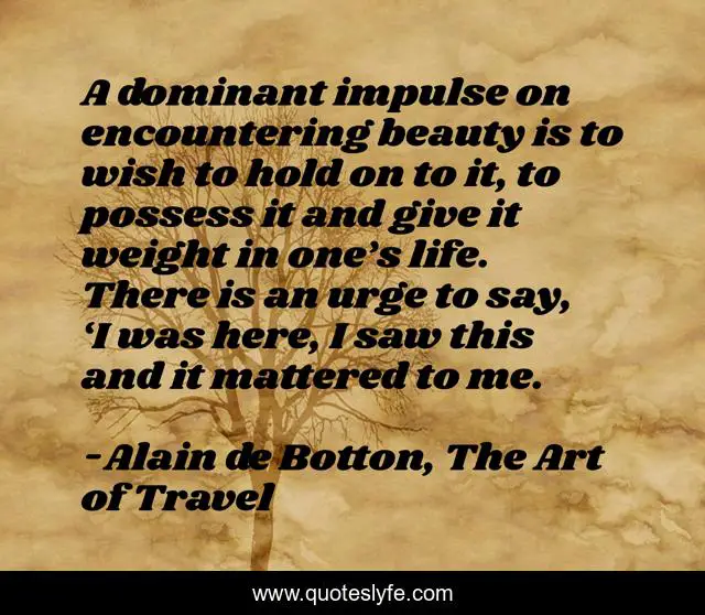 This page presents the quote "A dominant impulse on encountering beauty is to wish to hold on to it, to possess it and give it weight in one’s life. There is an urge to say, ‘I was here, I saw this and it mattered to me.". Author of this quote is Alain de Botton, The Art of Travel. This quote is about travel, beauty,.