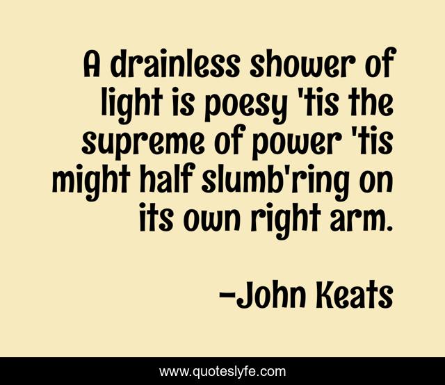 This page presents the quote "A drainless shower of light is poesy 'tis the supreme of power 'tis might half slumb'ring on its own right arm.". Author of this quote is John Keats. This quote is about poets, poetry,.