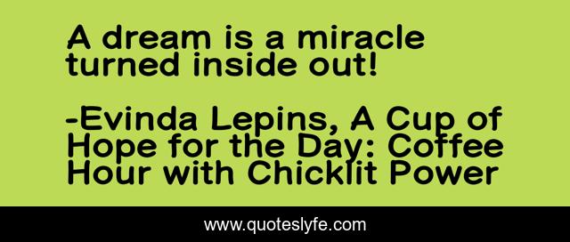 This page presents the quote "A dream is a miracle turned inside out!". Author of this quote is Evinda Lepins, A Cup of Hope for the Day: Coffee Hour with Chicklit Power. This quote is about dream, miracle,.