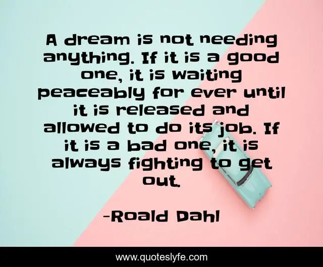 This page presents the quote "A dream is not needing anything. If it is a good one, it is waiting peaceably for ever until it is released and allowed to do its job. If it is a bad one, it is always fighting to get out.". Author of this quote is Roald Dahl. .