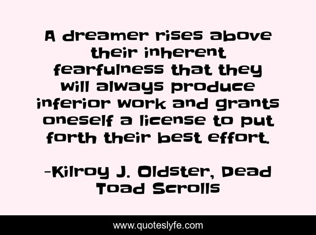 This page presents the quote "A dreamer rises above their inherent fearfulness that they will always produce inferior work and grants oneself a license to put forth their best effort.". Author of this quote is Kilroy J. Oldster, Dead Toad Scrolls. This quote is about best-effort, artist, artistic-vision, dreamers, artistic-passion, conquer-fear, dreamer,.