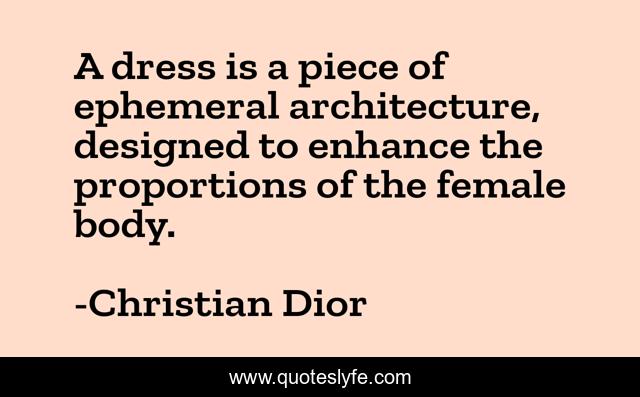 This page presents the quote "A dress is a piece of ephemeral architecture, designed to enhance the proportions of the female body.". Author of this quote is Christian Dior. This quote is about body, dress, female,.