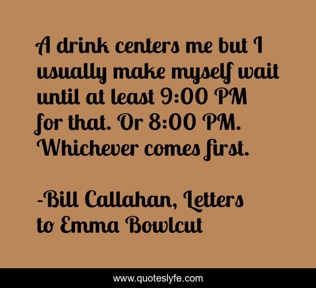 This page presents the quote "A drink centers me but I usually make myself wait until at least 9:00 PM for that. Or 8:00 PM. Whichever comes first.". Author of this quote is Bill Callahan, Letters to Emma Bowlcut. This quote is about drink, alcohol,.