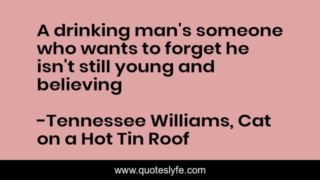 This page presents the quote "A drinking man's someone who wants to forget he isn't still young and believing". Author of this quote is Tennessee Williams, Cat on a Hot Tin Roof. This quote is about alcoholism, depression,.