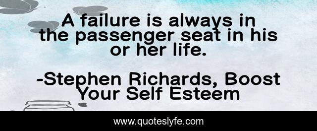 This page presents the quote "A failure is always in the passenger seat in his or her life.". Author of this quote is Stephen Richards, Boost Your Self Esteem. This quote is about wealth-creation, money, mind-body-spirit, optimistic, self-help, confidence, wealth, self-help-book, positive,.
