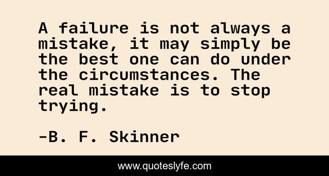 This page presents the quote "A failure is not always a mistake, it may simply be the best one can do under the circumstances. The real mistake is to stop trying.". Author of this quote is B. F. Skinner. This quote is about trying, best, mistake,.