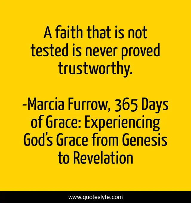 This page presents the quote "A faith that is not tested is never proved trustworthy.". Author of this quote is Marcia Furrow, 365 Days of Grace: Experiencing God's Grace from Genesis to Revelation. This quote is about trustworthy, faith, tested,.