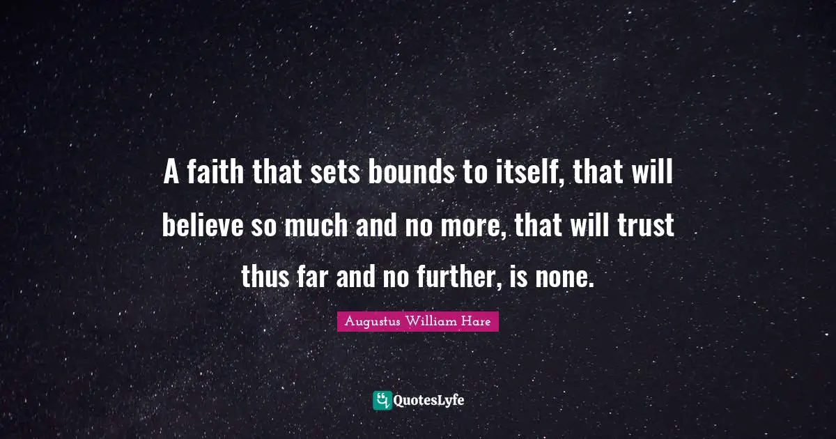 This page presents the quote "A faith that sets bounds to itself, that will believe so much and no more, that will trust thus far and no further, is none.". Author of this quote is Augustus William Hare. This quote is about believe, trust, faith, bounds,.