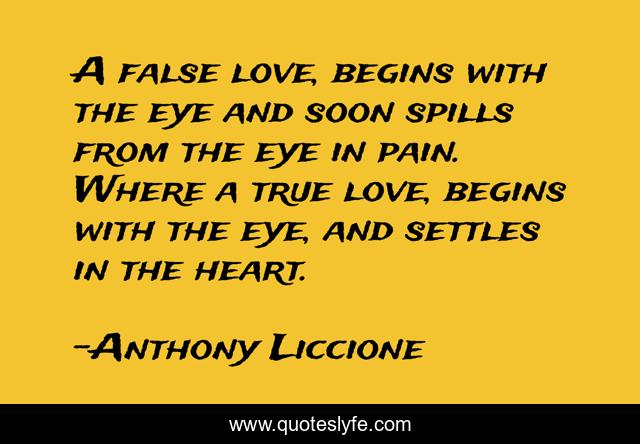 This page presents the quote "A false love, begins with the eye and soon spills from the eye in pain. Where a true love, begins with the eye, and settles in the heart.". Author of this quote is Anthony Liccione. This quote is about true-love, heart, eye, broken, settles, false-love, everlasting-love, tears, pain,.
