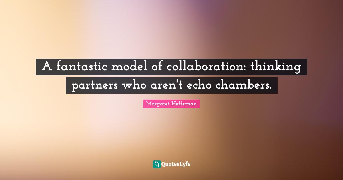 This page presents the quote "A fantastic model of collaboration: thinking partners who aren't echo chambers.". Author of this quote is Margaret Heffernan. This quote is about motivation, collaboration, thinking, partners, inspiration, fantastic,.