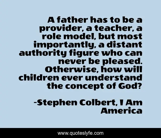This page presents the quote "A father has to be a provider, a teacher, a role model, but most importantly, a distant authority figure who can never be pleased. Otherwise, how will children ever understand the concept of God?". Author of this quote is Stephen Colbert, I Am America. This quote is about humor, family, satire, role-models, parenting, fatherhood,.
