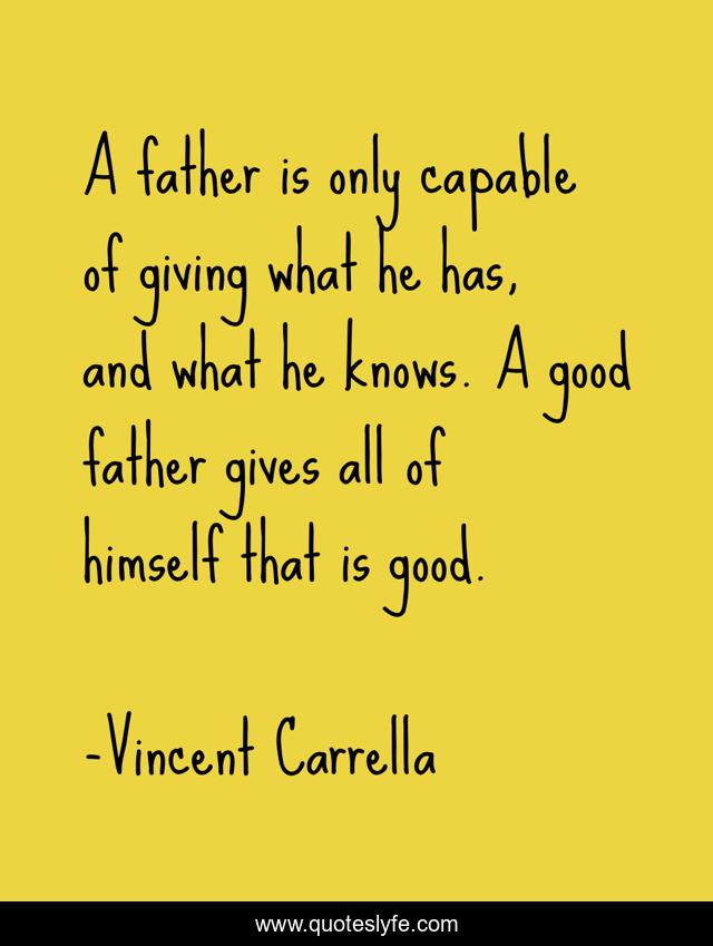 This page presents the quote "A father is only capable of giving what he has, and what he knows. A good father gives all of himself that is good.". Author of this quote is Vincent Carrella. This quote is about giving, fathers, father, children, fatherhood,.