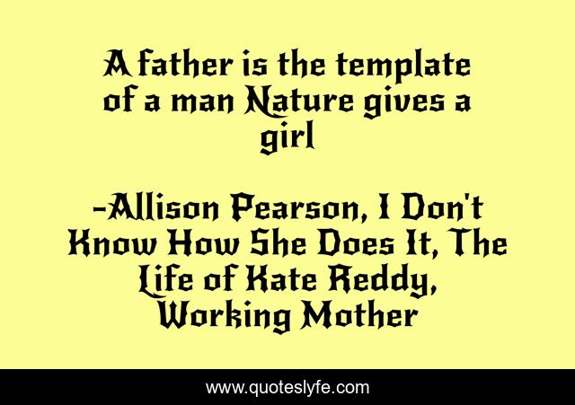 This page presents the quote "A father is the template of a man Nature gives a girl". Author of this quote is Allison Pearson, I Don't Know How She Does It, The Life of Kate Reddy, Working Mother. .