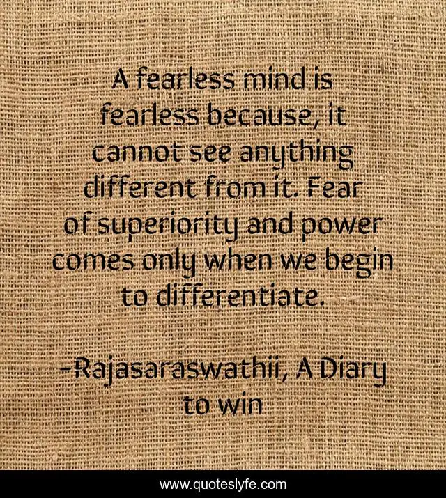 This page presents the quote "A fearless mind is fearless because, it cannot see anything different from it. Fear of superiority and power comes only when we begin to differentiate.". Author of this quote is Rajasaraswathii, A Diary to win. This quote is about life, fearless, energy, motivational, confidence, wisdom, philosophical, optimistic, inspirational-fiction,.