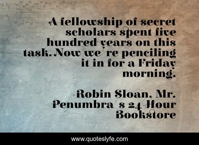 This page presents the quote "A fellowship of secret scholars spent five hundred years on this task. Now we're penciling it in for a Friday morning.". Author of this quote is Robin Sloan, Mr. Penumbra's 24-Hour Bookstore. This quote is about five-hundred-years, secret, penciling-it-in, scholars,.