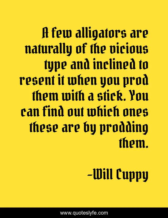 This page presents the quote "A few alligators are naturally of the vicious type and inclined to resent it when you prod them with a stick. You can find out which ones these are by prodding them.". Author of this quote is Will Cuppy. This quote is about animals, humor, reptiles,.