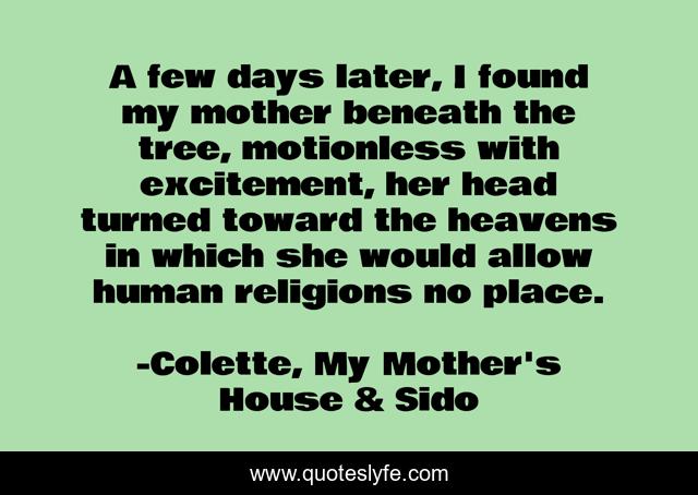 This page presents the quote "A few days later, I found my mother beneath the tree, motionless with excitement, her head turned toward the heavens in which she would allow human religions no place.". Author of this quote is Colette, My Mother's House & Sido. .