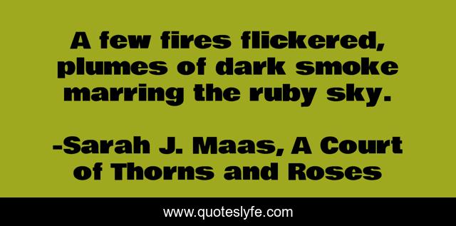 This page presents the quote "A few fires flickered, plumes of dark smoke marring the ruby sky.". Author of this quote is Sarah J. Maas, A Court of Thorns and Roses. This quote is about fire, retelling, acourtofthornsandroses, sarahjmaas, brutally-beautiful,.