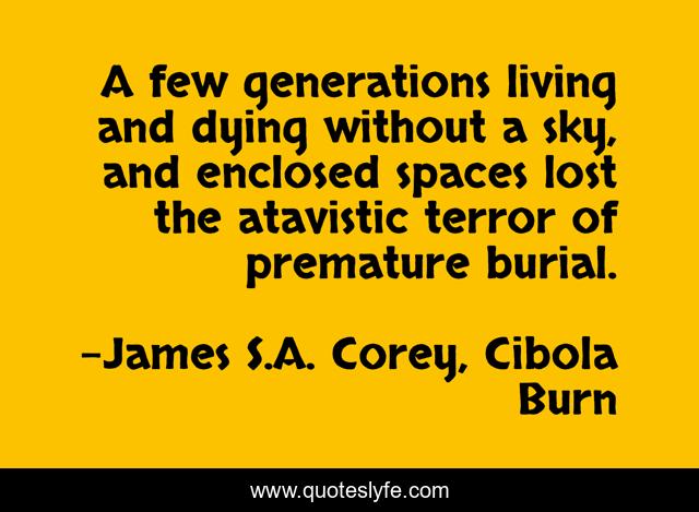 This page presents the quote "A few generations living and dying without a sky, and enclosed spaces lost the atavistic terror of premature burial.". Author of this quote is James S.A. Corey, Cibola Burn. This quote is about burial, death, sky, atavistic, terror, fear, space-exploration,.